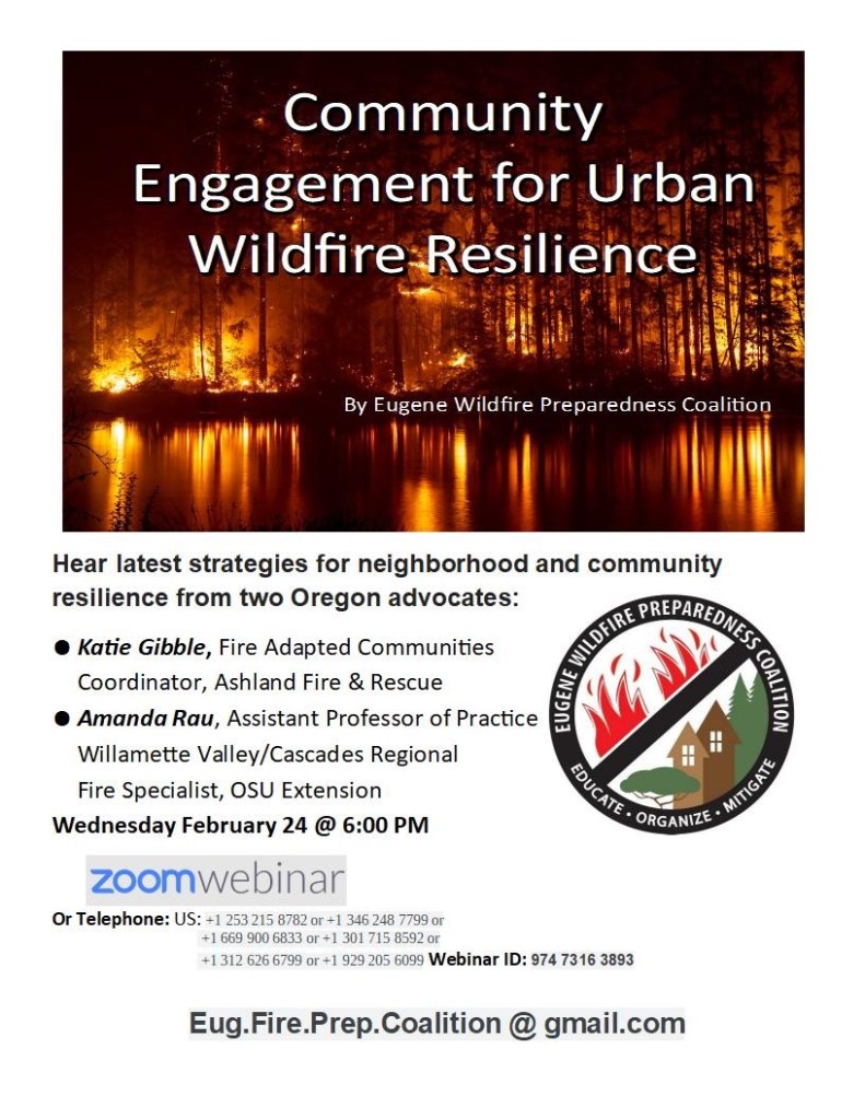 The Eugene Wildfire Preparedness Coalition is having another Zoom presentation to help residents of our neighborhood prepare. This meeting is one in a series on preparing your neighborhood & home home for fire. The event will be held on Wednesday, February 24th at 6:00pm. Join us on Zoom.