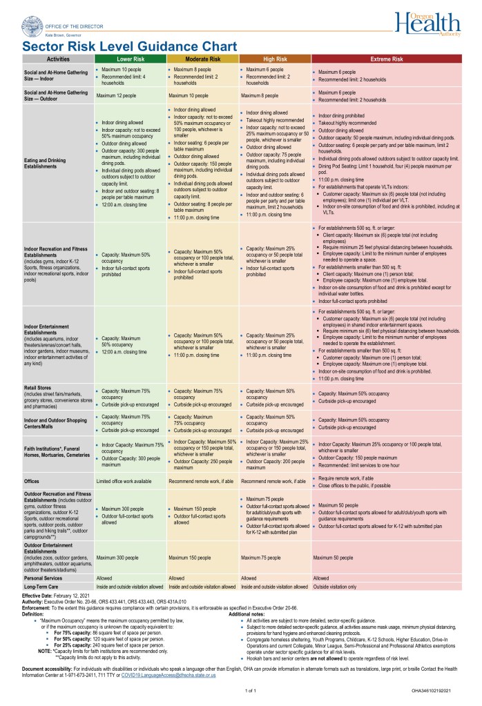 Oregon’s Risk and Protection Framework uses data to help inform safety measures at the county level. Every two weeks, Governor Kate Brown’s office announces the revised risk status of each county based on current data. Lane County has lowered into the high risk category for the two-week period beginning February 26.