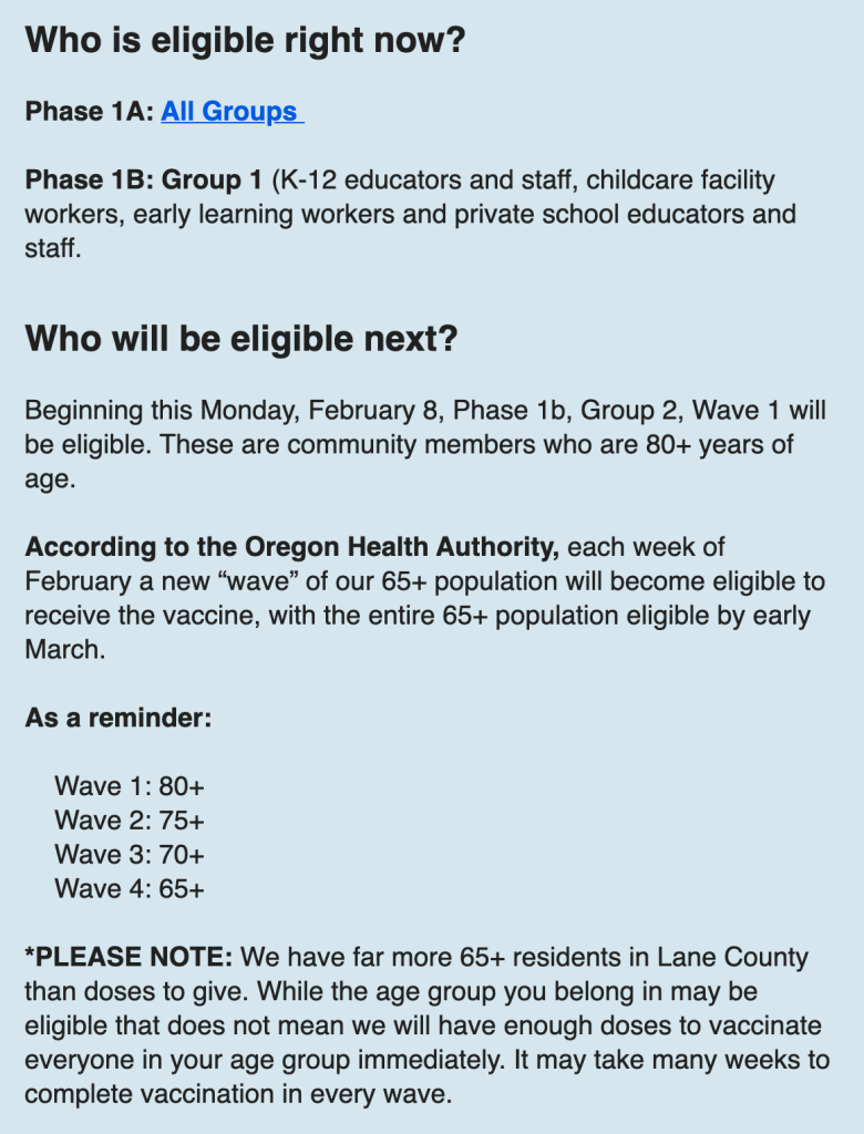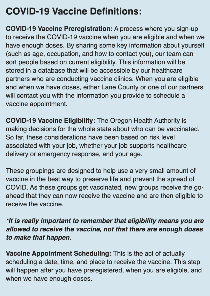 If you haven’t already done so, you can fill out Lane County Public Health’s pre-registration for vaccination, available to all members of the public. Pre-registration will help create a centralized database to help health partners countywide contact those who wish to be vaccinated and schedule an appointment when they are eligible.