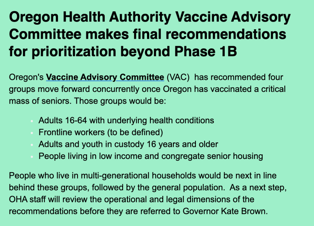 We heard from the Oregon State Vaccine Advisory Committee that individuals under 65 years of age with preexisting conditions and “essential workers” will be prioritized following our 65+ population. As we receive more detailed information, we will communicate that through this email.