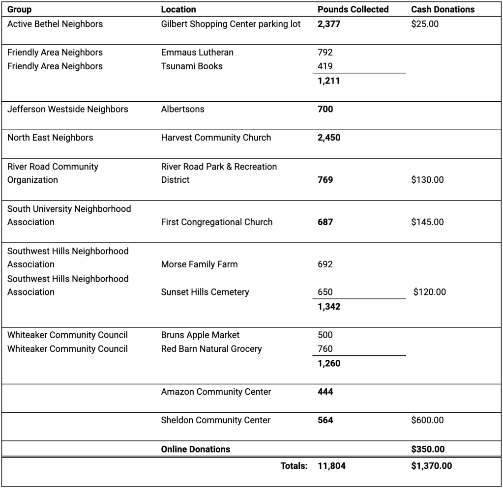 Hello everyone! Thank you so much for your donations over the past weekend, everyone who participated made this drive possible. The turnout at all the food drives was so unprecedented that it took a few days for Food For Lane County to pick everything up and sort through it. Here are the total collections from each donation site below.