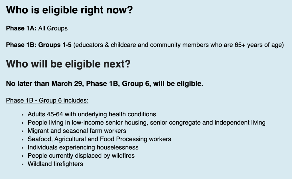 All individuals in Lane County are encouraged to utilize the Vaccine Preregistration Form to ensure they are contacted for scheduling as early as possible. Although you may not receive an appointment until summer, this is the best way to claim a spot for your shot.