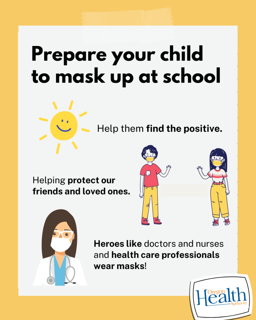 As parents, we’re asked to do a lot to keep our kids safe. It’s been especially true through this pandemic. It is normal to feel anxious, unsure and tired. With school starting so soon, it’s okay to feel uncertain about how to talk to kids about masking. OHA’s statewide rule for 2021-22 school year requires face coverings in all indoor school settings, both public and private, for all people two years and older, including all students, staff, contractors, volunteers and visitors.