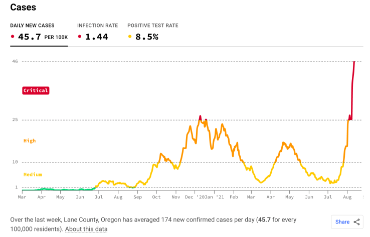 Yesterday, 264 positive cases were reported in Lane County within 24 hours – the highest one day total for the county since the pandemic began in 2020.