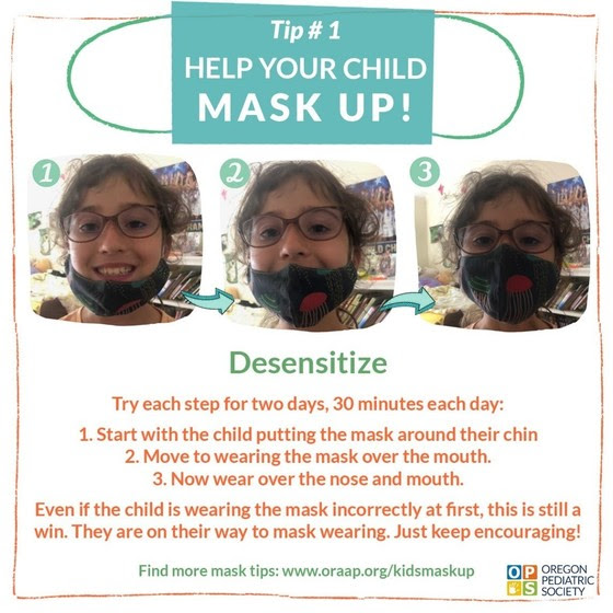 Children who are sensitive may find it difficult to become comfortable with wearing a mask. Dr. Elizabeth Super, a pediatrician at Oregon Health & Science University’s Doernbecher Children’s Hospital, wrote a great article called, From “No!” to Masking Pro: Helping Your Hesitant Child Mask Up,on the Oregon Pediatric Society’s website.