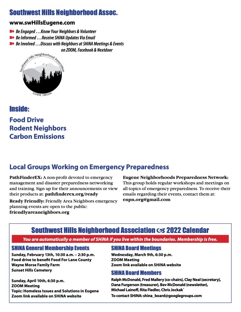 All participating neighborhoods will be holding a food collection drive to benefit Food For Lane County this Sunday, February 13th from 10:30am – 2:30pm. All participating Donation drop sites are listed on the Flyer. The Southwest Hills Neighborhood Association will be collection donations at Wayne Morse Family Farm located at 595 Crest Drive.