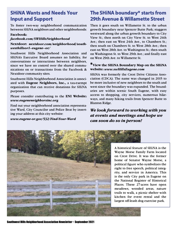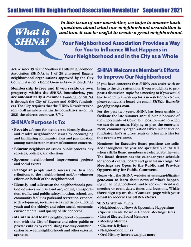 Concerned about fire resilience and tree health? Wondering about the city’s initiatives to meet the goal of 30% tree canopy? Scott Altenhoff is the City of Eugene’s Urban Forest Analyst and Lead Arborist who has been working in the Parks and Open Spaces Division for over 16 years. Prior to that he worked as a commercial arborist. Scott will be our main speaker at the SHiNA General Meeting on Sunday, September 12th at 6:30pm.